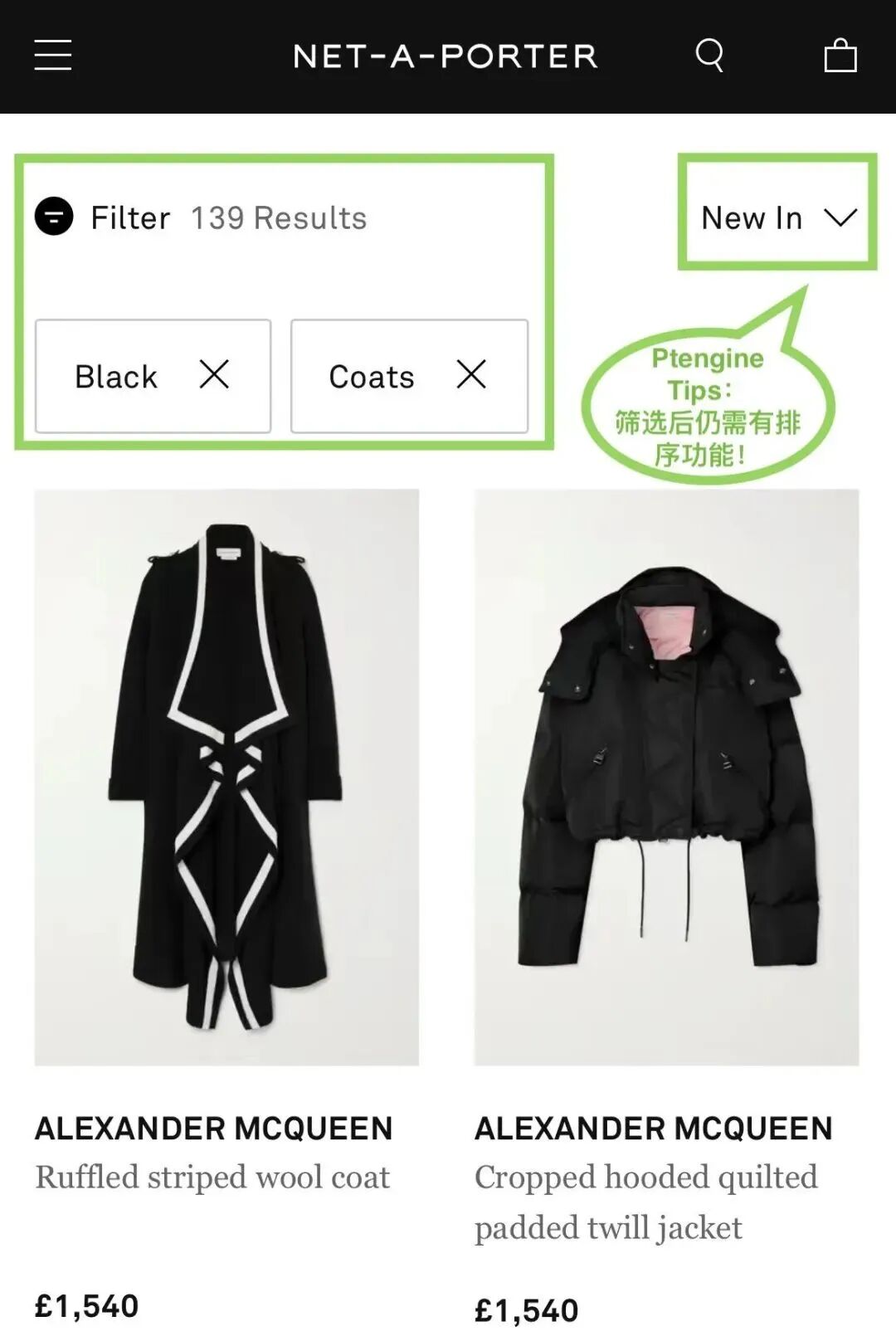 这个元素在列表页中是必不可少的,且筛选条件取决于商品属性。例如,服装可以根据出席场合进行筛选,鞋类可以根据功能进行筛选。当消费者筛选后,筛选条件需向消费者展示,且告知消费者有多少件商品是符合需求的。