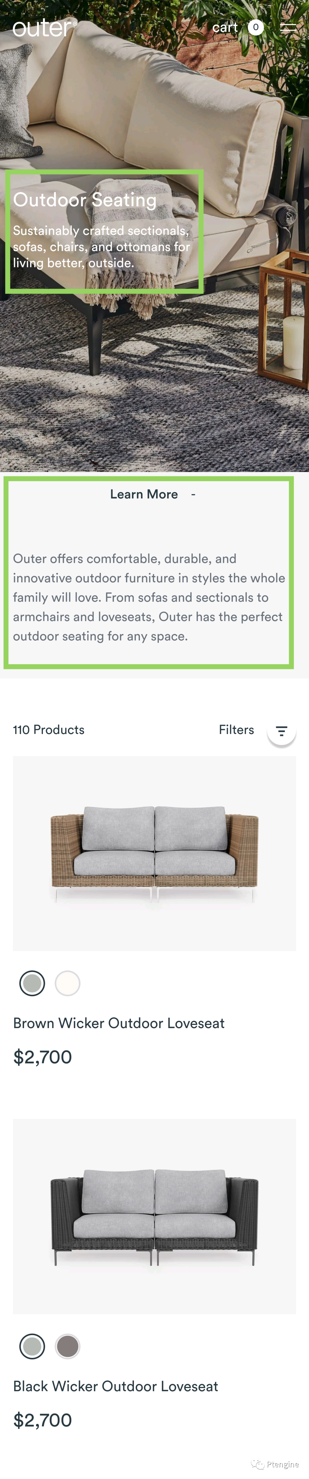在下面这个案例中,outer通过图片+文字向消费者传递了环保、舒适、社交、户外等多个信息。通过这样的方式让消费者再继续向下浏览商品时都能够知道outer户外家具的特点。