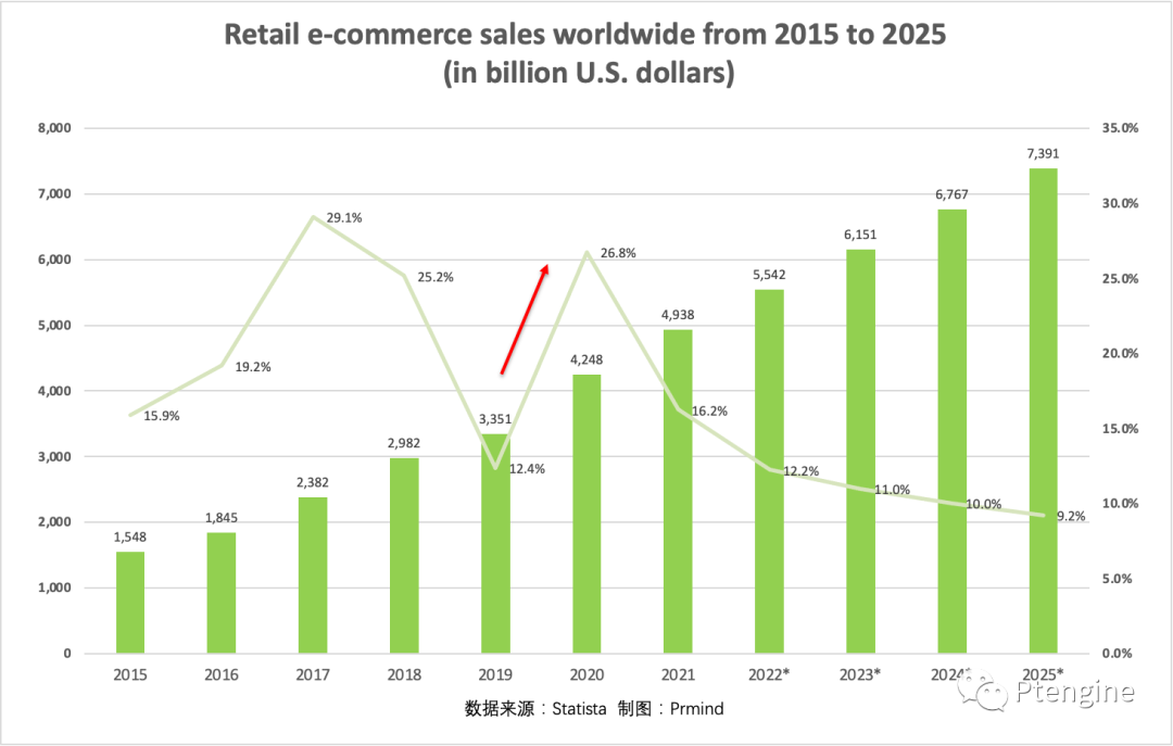 自2019疫情爆发以来,全球线上购物需求激增,2020年全球零售电商销售额同比增长26.8%;2021年同比增长16.2%,达到49.38万亿美元(约合人民币:318.56万亿元)。基于疫情的影响,海外电商需求仍在不断增加。