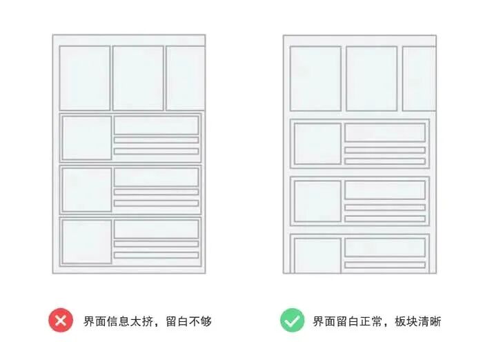 所谓留白,就是页面的整体感受不能给用户带来压迫感,增加阅读时的“呼吸感”。如下图所示,可以比较一下这两个页面排版的差异。