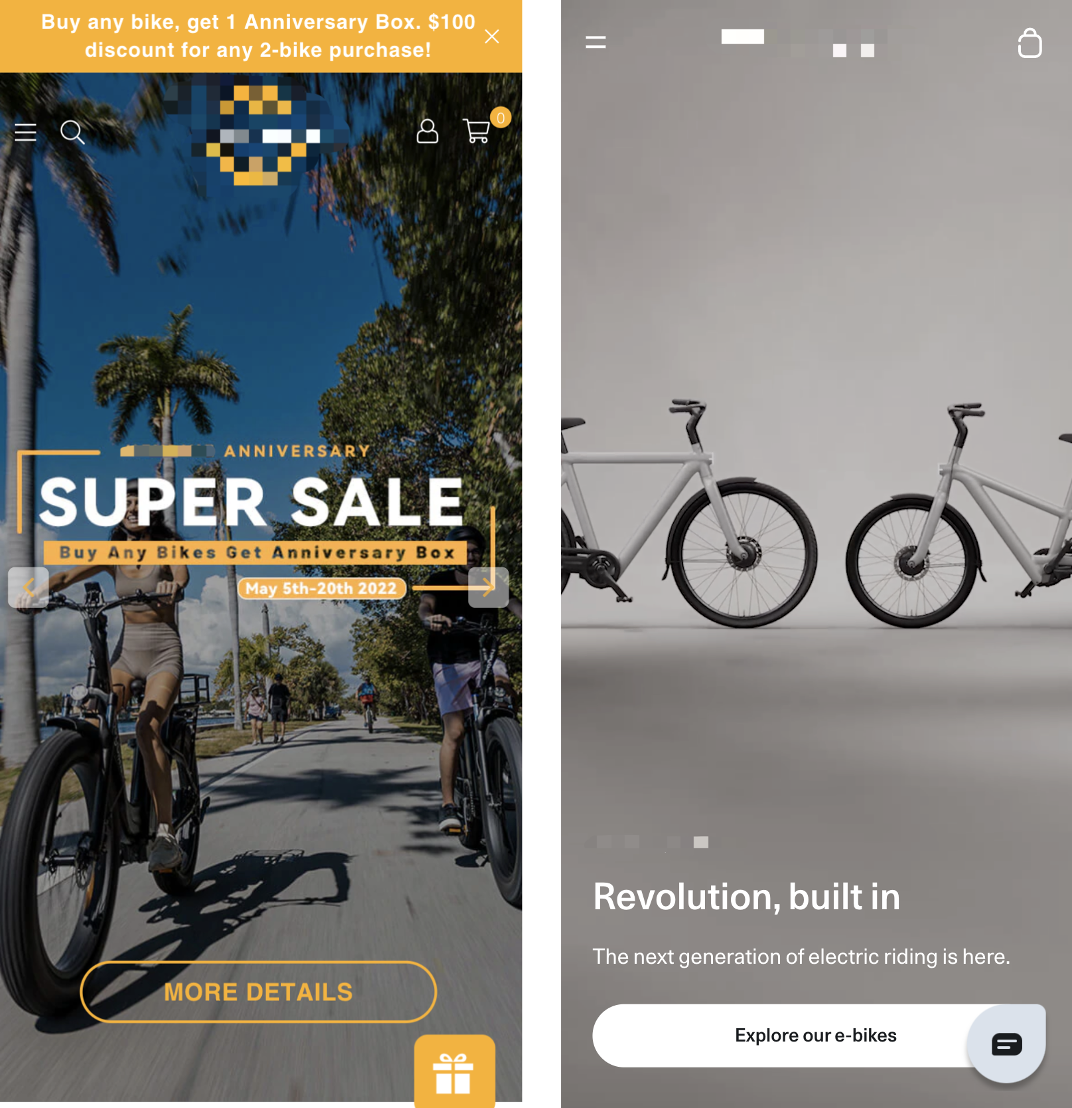 如上所示,同为电动自行车的DTC品牌,右边的落地页相对于左边的来说,因为元素相对较少,反而让主题更专注、清晰,引导动作也更聚焦。
