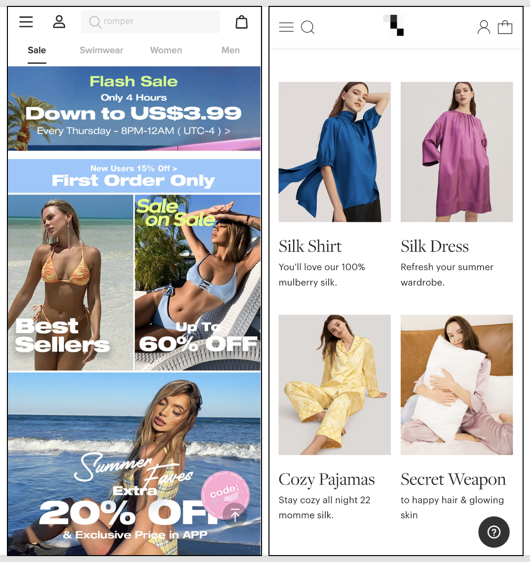 如上所示,同为服装DTC独立站,右边的图相对于左边的来说,更充分的考虑了留白,从而让页面更清晰且更有品质感。