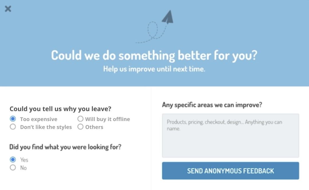在实操过程中,你可以在用户准备放弃购物车或者准备离开网站时弹出一个表单,通过1-2个简短的问题来收集更多信息。这里我们建议表单中收集的信息应该与他们离开的直接原因相关,也可以问问如果你做什么可以改变他们的想法和行为。