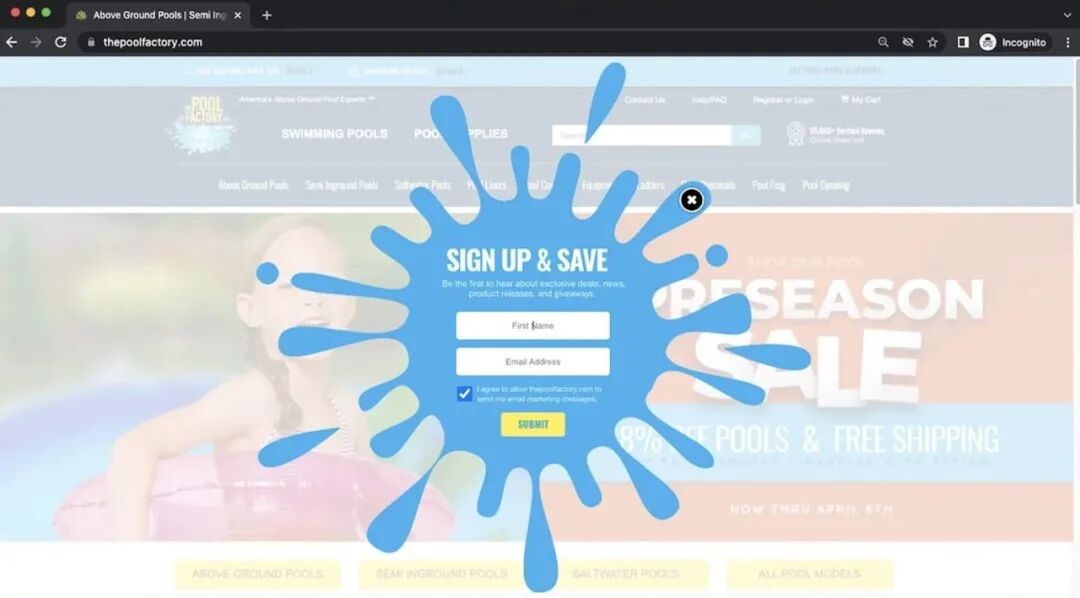 The Pool Factory 是一家销售泳池相关产品的公司。他们的弹出式设计有类似于水花飞溅的效果,能够很好地引起注意。