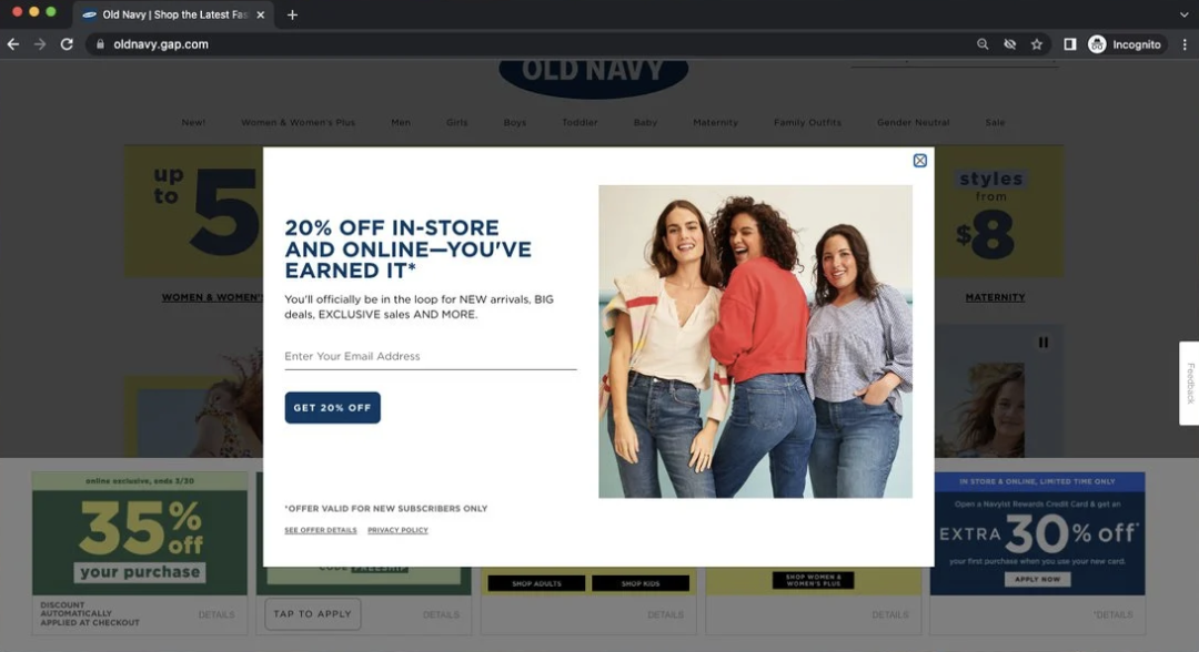 Old Navy 的弹窗以 20% 的折扣为标题,以“这是你挣来的”这样的正向话语收尾。