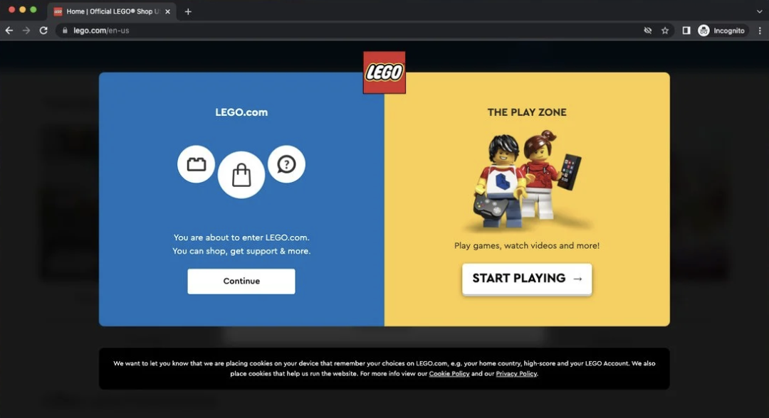 对于乐高,这样的选择也很有用。“Continue”将用户重定向到在线商城;“Start Playing”将用户重定向到乐高的主页和游戏区——从最开始就给访问用户进行一次很简单的分类。这意味着乐高网站可以基于此提供更多有针对性的东西。