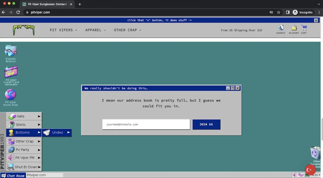 墨镜公司 Pitviper 的复古风格网站上显示着一个老式窗口——它与网站主页融为一体,甚至看起来都不像一个弹窗。