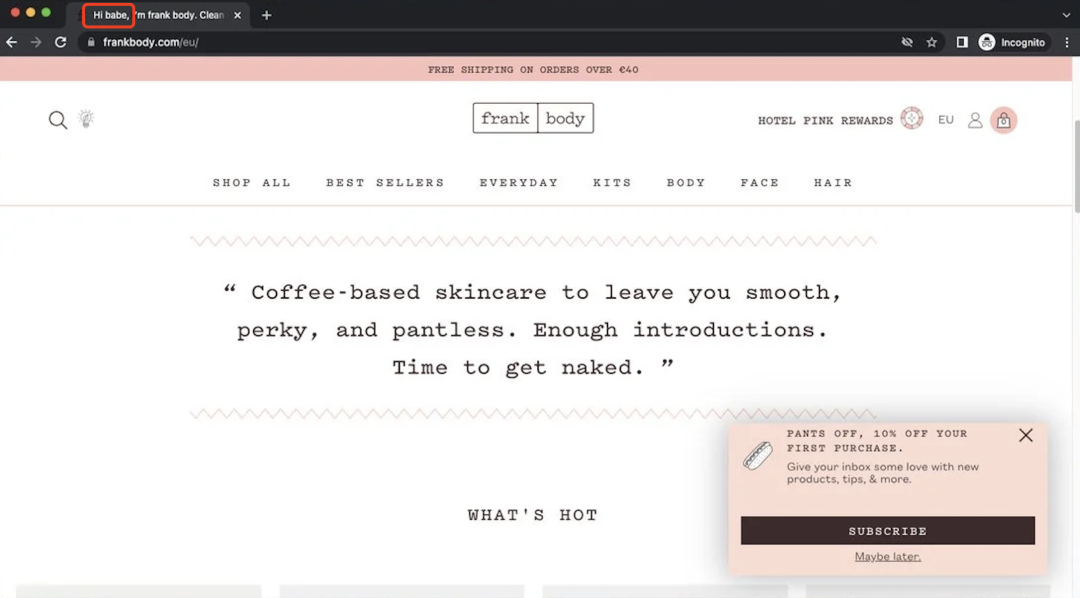 Frank Body 是一个专注于痤疮问题的护肤品牌。他们的弹窗充分展示了如何让一切元素与品牌风格一致: