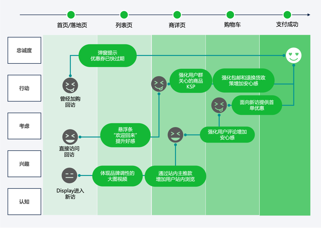 第二,弹窗的目的是什么?有了用户分类,我们就有了针对不同类型客户的不同运营目的。可以从用户购买旅程入手——认知、兴趣、考虑、行动、忠诚度。