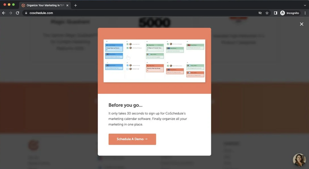 在弹窗中显示产品的预览图像对于推广产品很有用。在购买和订阅服务之前,用户可以预先看到他们会得到什么。显示“安排演示”的按钮重定向到演示预约,并提供了试用产品的机会。