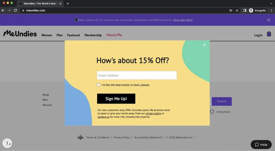 MeUndies 是一家内衣公司。他们在这一界面中使用了简单明了的弹窗:“15% 折扣怎么样?”