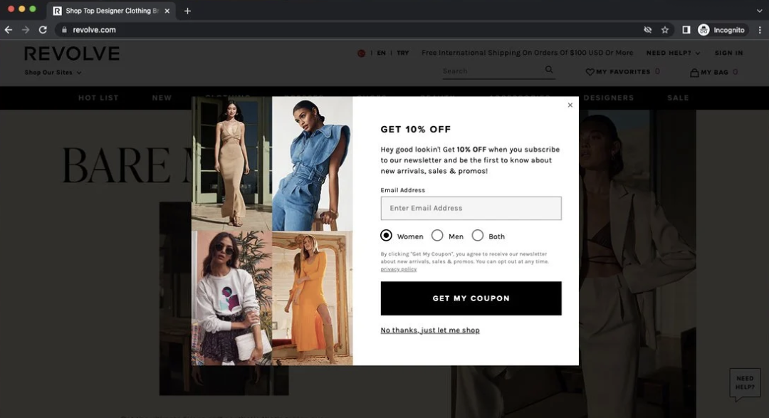 设计师服装品牌 Revolve 的电子邮件弹窗同样以折扣优惠开头。