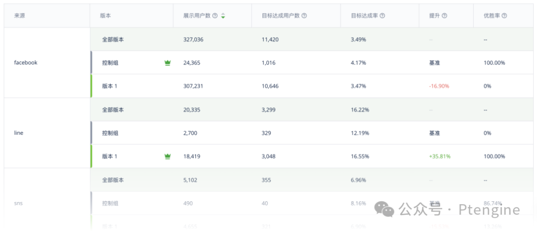 如上图所示,即使整体测试结果没有获胜者,但你可能会发现来自Facebook广告的用户在某个版本上胜出,而来自Line营销活动的用户在另一个版本上胜出。当你找到类似的洞察时,你甚至可以将不同的版本个性化展示给相应的用户,以在整体上获得更高的转化率。